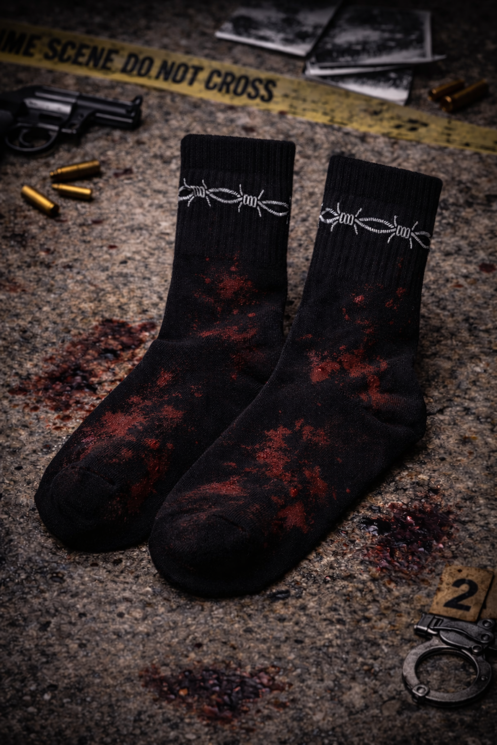 Czarny materiał z oplotem drutu kolczastego przy kostce mówi jasno — granice są po to, żeby je łamać.