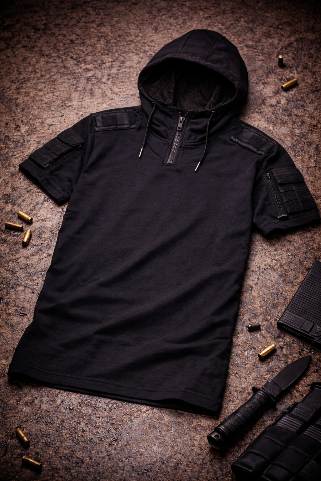 Półrozpinany front, siatkowa osłona kaptura i zapinane kieszenie typu tactical na ramionach sprawiają, że wygląda jak sprzęt operacyjny — ale nosi się ją jak ulubiony T-shirt.