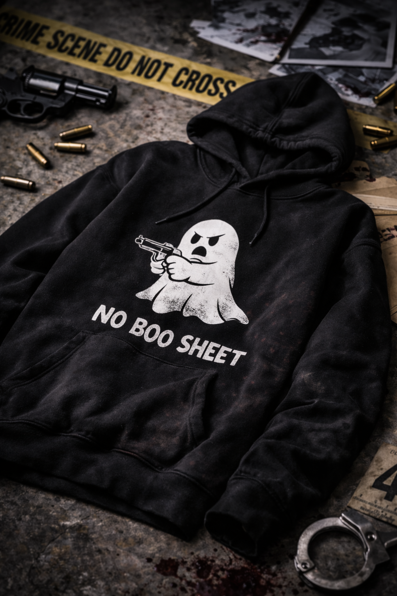 Czerń bluzy staje się tłem dla nadruku, który od razu przyciąga wzrok. Na froncie pojawia się zadziorny duch trzymający pistolet — uroczo groźny, komiksowy, a jednocześnie pewny siebie. Pod nim widnieje hasło „NO BOO SHEET”, które jednym zdaniem zdradza charakter projektu: zero wymówek, zero ściemy.